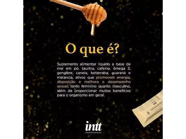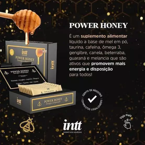 O power honey da Intt Cosméticos é um suplemento alimentar líquido a base de mel em pó, taurina, cafeína, ômega 3, gengibre, canela, beterraba, guaraná e melancia que são ativos que promovem mais energia, disposição.